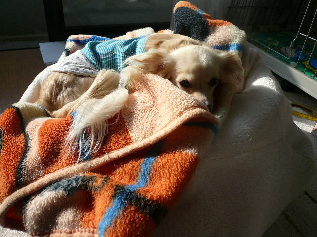 すぐにいつもの定位置におさまる笑(ラブ→バッグイン モモ→パパ膝の上)