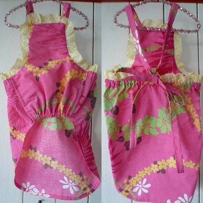 ショッキングピンクのハワイアン生地にイエローのフリルで