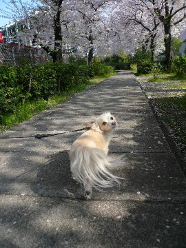 最後に、散歩中に腕をプルプルさせながら撮ったモモの桜ショットを・・・